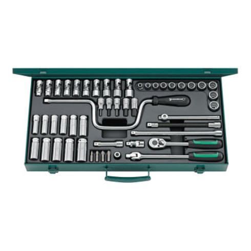 Composition de douilles carré 3/8" en coffret robuste en tôle d´acier,50 piècesComposition:11 Douilles, 12 pans réf. 45: 8; 10; 11; 12; 13; 14; 15; 16; 17; 18; 19 mm9 Douilles, longues, réf. 46: 10; 11; 12; 13; 14; 15; 17; 18; 19 mm2 Douilles, 12 pans, longues, avec intérieur caoutchouc, réf. 4600: 16 mm - 5/8", réf. 46: 20,8 mm - 13/16"10 Douilles UNIFLEX, 12 pans, réf. 47: 10; 11; 12; 13; 14; 15; 16; 17; 18; 19 mm5 Douilles INHEX réf. 49: 4; 5; 6; 8; 10 mm4 embouts BITS pour vis à empreinte cruciforme Phillips-Recess® 1231: taille 1; 1232: taille 2; 1233: taille 3; 1234: taille 41 Cliquet réf. 4351 Vilebrequin réf. 4212 Rallonges réf. 427/3 (76 mm), réf. 427/10 (240 mm)1 Poignée articulée réf. 4241 Poignée coulissante réf. 4251 Embout cardan réf. 4281 Rallonge flexible réf. 4341 Embout cardan réf. 443