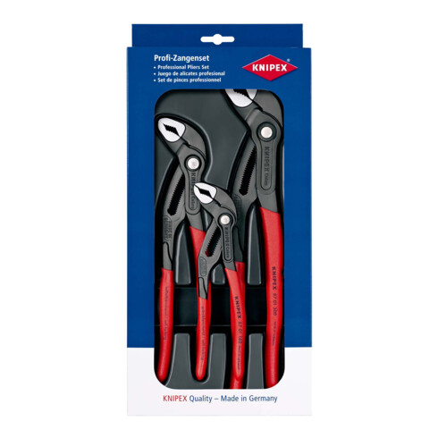 - pinces grises atramentisées, poignées avec gainage en plastique antidérapantLivré avec: 1 x 87 01 180 KNIPEX Cobra® Pince multiprise de pointe, 1 x 87 01 250 KNIPEX Cobra® Pince multiprise de pointe, 1 x 87 01 300 KNIPEX Cobra® Pince multiprise de pointe,