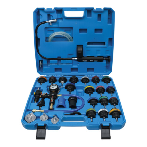 Le kit de test de pression pour systèmes de refroidissement BGS est un ensemble d'outils complet pour le contrôle d'étanchéité et le remplissage des systèmes de refroidissement.