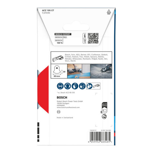 - La lame segmentée EXPERT ACZ 105 ET Multi Material pour outils multifonctions est une avancée supplémentaire dans la technologie Bosch Carbide : pour la première fois, une large bande en carbure incurvée est soudée de manière fixe à une lame pour outils multifonctions