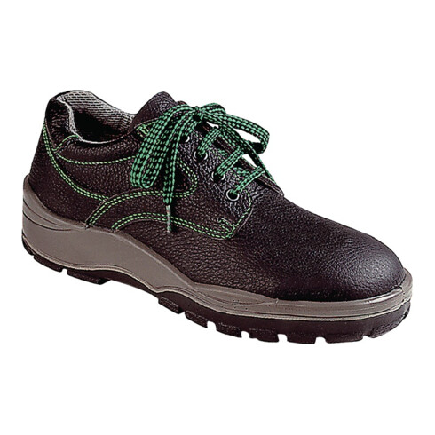 DIN EN ISO 20345:2011 · S3 SRA · Dessus : tige en cuir de vachette noir/gris, hydrofuge · surpiqûre contrastante verte · bord de la tige et rembourrage des rabats ·