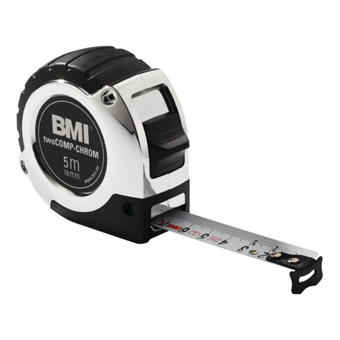 boîtier plastique chromé avec frein à bande et retour automatique du ruban · grande résistance grâce aux larges bandes arrondies · boîtier avec clip · emballage pour libre-service · Classe de précision CE II · Autres caractéristiques techniques Graduation: mm/cm · Boîtier: matière synthétique · Précision: CE II