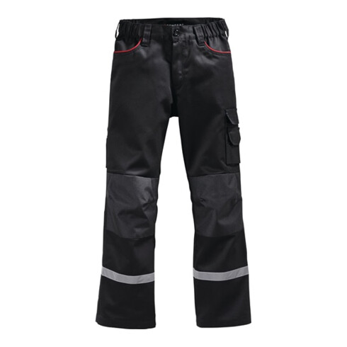 Matière : 65 % polyester, 35 % coton · renforts aux genoux : 100 % polyester · pantalon à taille élastique ultra résistant pour enfants · coutures triples aux points de tension · renforts robustes aux genoux · réflecteurs à l'avant et à l'arrière pour une sécurité accrue · coupe confortable et optimale pour enfants avec fermeture éclair de marque à l'avant · boucle porte-marteau ajustable, poches cuisses et arrière · double poche pour mètre pliant · mousqueton
