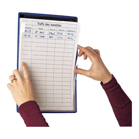 DIN A4 · utilisation polyvalente · 2 bandes transparentes en PVC tendre maintiennent la feuille · fixation par anneaux ou aimant · film PVC très résistant, antireflets avec cadre en fil d'acier à gainage plastique bleu · unités d’emballage = 5 pièces