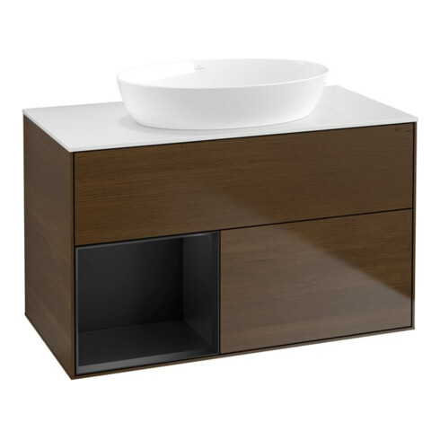 TTCV&B Finion 100 Meuble sous lavabo avec éclairage mural, blanc, tiroir bleu avec laque, noyer veneer