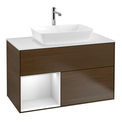 TTCV&B Finion 100 Meuble sous lavabo, éclairage mural, blanc mat, poignée blanc mat Lac, noyer ven
