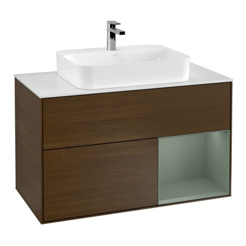 TTCV&B Finion 100 Meuble sous lavabo, éclairage mural, blanc mat, réglette droite, olivier mat laqué, noyer veinée