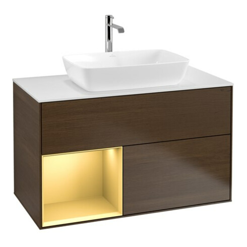 TTCV&B Finion 100 Meuble sous lavabo, éclairage mural, blanc mat, réglette or mat, noyer veinée