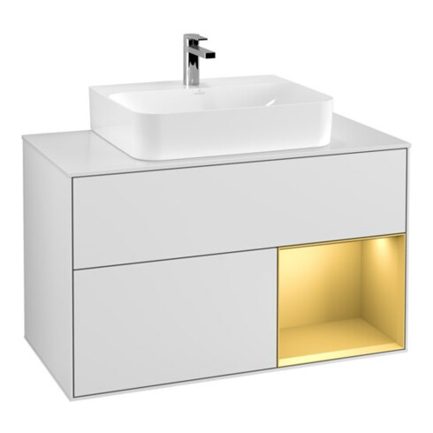 TTCV&B Finion 100 Meuble sous lavabo, éclairage mural, blanc, réglette droite or, blanc laqué