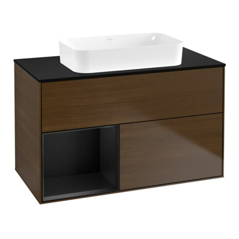 V&B Finion Meuble sous lavabo 100x60,3 cm, éclairage mural, rég. gauche, bleu m Lac, noyer ven