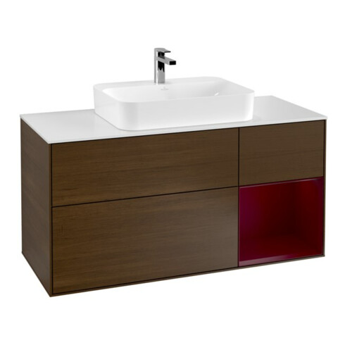 V&B Finion Meuble sous lavabo 120 cm, blanc, avec éclairage mural, tiroir à droite, poignée bois veneer