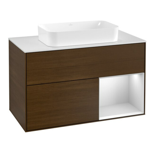 V&B Meuble sous lavabo avec plan de travail blanc Finion 100x60,3cm, étagère droite blanc avec placage noyer