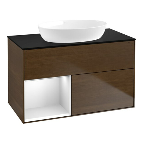 TTCV&B Meuble sous-lavabo Éclairage mural Finion 100, bleu, étagère blanche laquée, noyer veinée