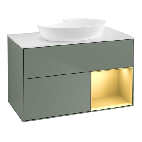 TTCV&B Meuble sous lavabo Finion 100, blanc mat, porte en verre mat laqué, poignée en laque