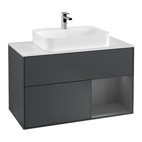 TTCV&B Meuble sous lavabo Finion 100, blanc mat, rangement armoires, avec miroir laqué bleu