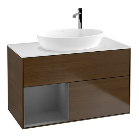 TTCV&B Meuble sous lavabo Finion 100, blanc mat, tiroir anthracite laqué, veinage bois