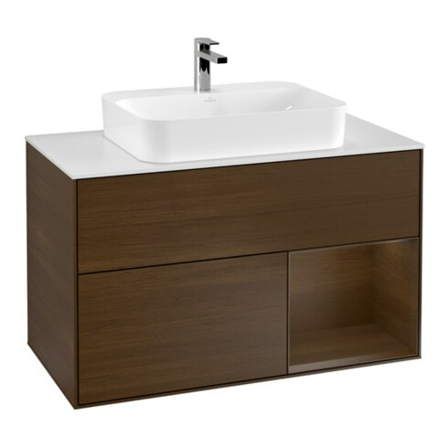 V&B Meuble sous lavabo Finion 100, blanc mat, tiroir droite, noyer veneer