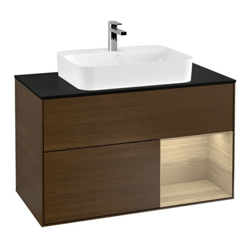 TTCV&B Meuble sous lavabo Finion 100, bleu clair, avec éclairage mural, porte droite, finition noyer