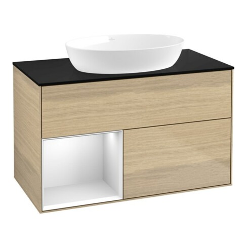 TTCV&B Meuble sous lavabo Finion 100, bleu, étagère blanche avec laque, éclairage mural