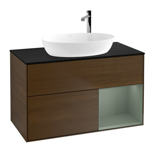 TTCV&B Meuble sous lavabo Finion 100, bleu, tablette en verre, laqué, noyer veinée