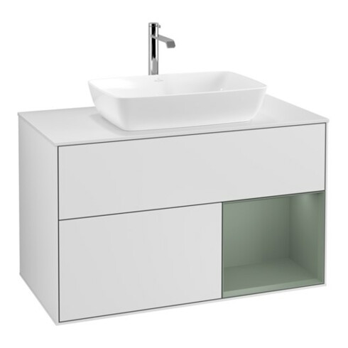 TTCV&B Meuble sous lavabo Finion 100, éclairage mural, blanc mat, réglette olivier mat lacqué, blanc mat lacqué