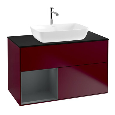 TTCV&B Meuble sous-lavabo Finion 100, éclairage mural, plaque d’habillage bleue, étagère médiane laquée, poignée métallique