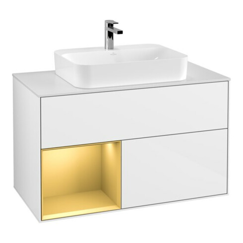 TTCV&B Meuble sous lavabo Finion 100, pl blanc mat, rég gauche, poignée métal, laqué blanc brillant
