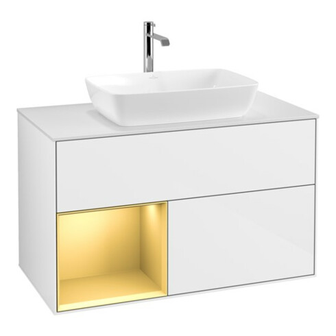 TTCV&B Meuble sous lavabo Finion 100, placage bois, rangement doré mat, laque blanche brillante