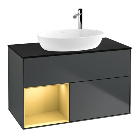 TTCV&B Meuble sous lavabo Finion 100, placage bouleau mat, réglette dorée mat, médium bleu mat