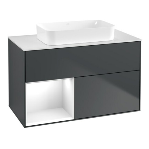 TTCV&B Meuble sous lavabo Finion 100x60,3 cm, blanc brillant, façade bois laqué bleu mat