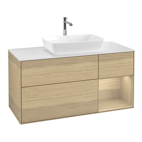 TTCV&B Meuble sous lavabo Finion 120 cm, blanc brillant, avec tiroir ouvert