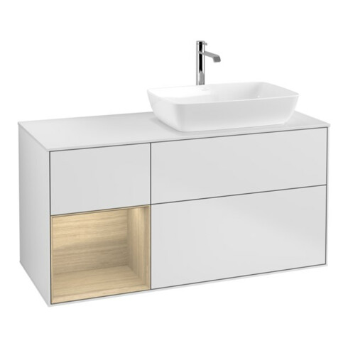 TTCV&B Meuble sous lavabo Finion 120 cm, blanc mat, avec tiroir ouvert, blanc mat laqué