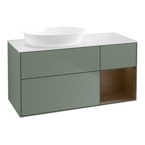 TTCV&B Meuble sous lavabo Finion 120 cm, blanc mat, étagère noyer verni, poignée laquée