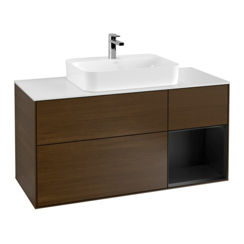 TTCV&B Meuble sous lavabo Finion 120 cm, blanc mat, tiroir à droite, bleu mat laqué, noyer veiné