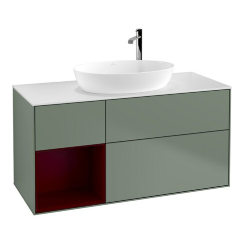 TTCV&B Meuble sous lavabo Finion 120 cm, blanc mat, tiroir avec laque, olivier avec laque