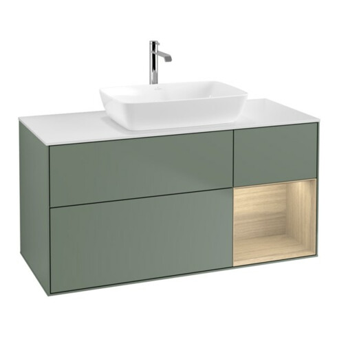 TTCV&B Meuble sous-lavabo Finion 120 cm, blanc mat, tiroir ouvert, poignée laquée