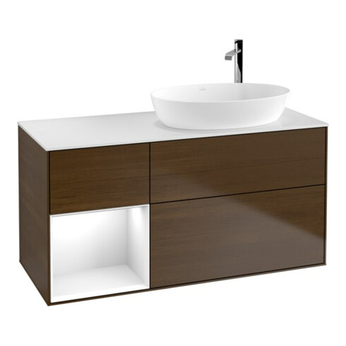 TTCV&B Meuble sous lavabo Finion 120 cm, éclairage mural, blanc brillant, laqué, noyer veneer