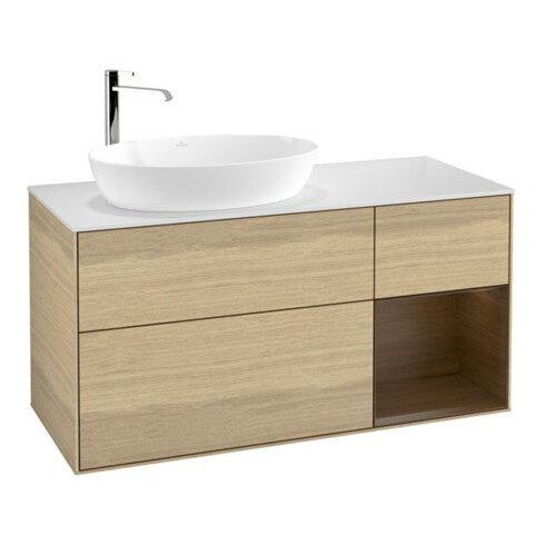 TTCV&B Meuble sous lavabo Finion 120 cm, pl blanc mat, régule noyer veinée, ouvrant noyer veinée