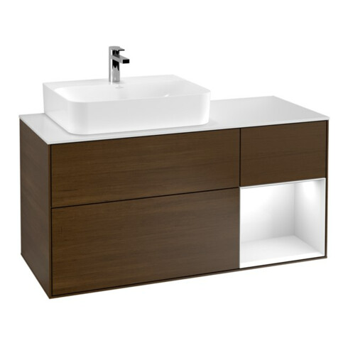TTCV&B Meuble sous lavabo Finion 120 cm, placage bois, brillant blanc, laqué, noyer veneer