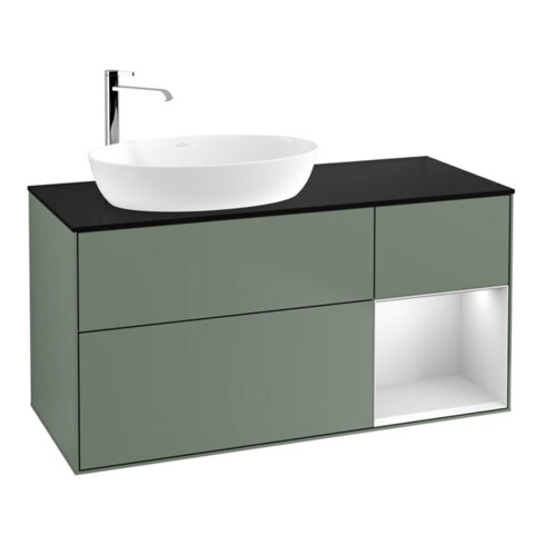 TTCV&B Meuble sous lavabo Finion 120 cm, placage bois, rangement blanc laqué, olivier laqué