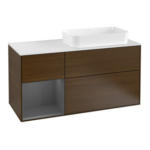 TTCV&B Meuble sous lavabo Finion 120 cm, Plaqué blanc mat, Tiroir gauche Anthracite mat, noyer veiné