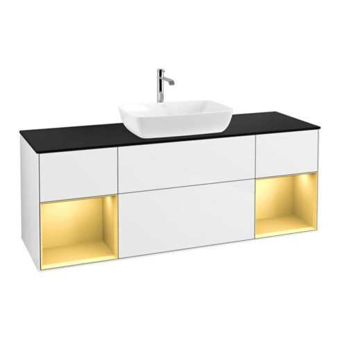TTCV&B Meuble sous lavabo Finion 160 cm, placage bois, rangement doré mat, laqué blanc brillant