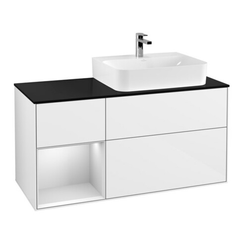 TTCV&B Meuble sous lavabo Plaque de recouvrement bleu glace avec Finion 120 cm, étagère gauche blanc mat avec laque blanc brillant